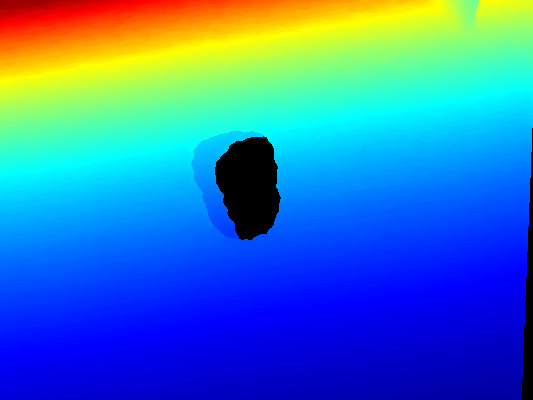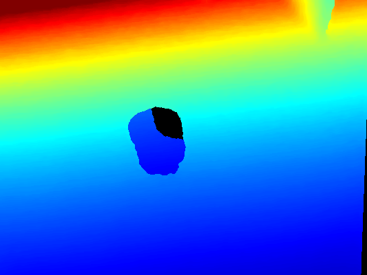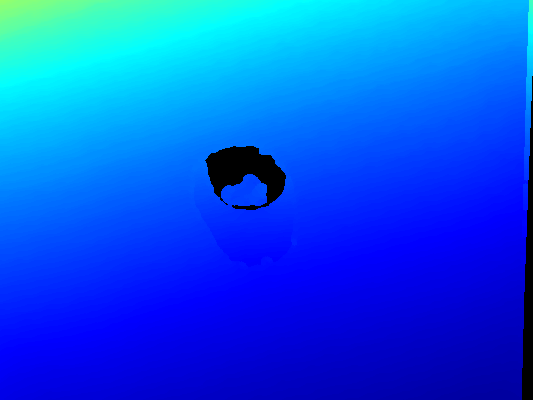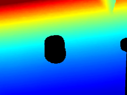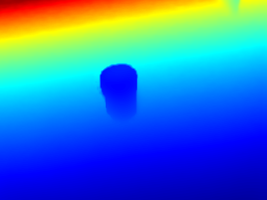 - Segmentation mask: the original depth image has erroneous values for pixels corresponding to transparent/reflective objects that are unreliable. We use a deep convolutional semantic segmentation network (Deeplabv3+ with DRN-D-54 backbone) to predict a binary mask of transparent/reflective objects from a color image, and use the mask to remove all unreliable pixels from the original depth. (See fig 2 for mask and intermediate depth)